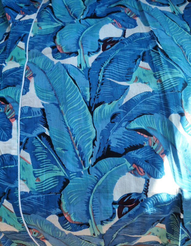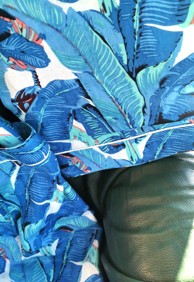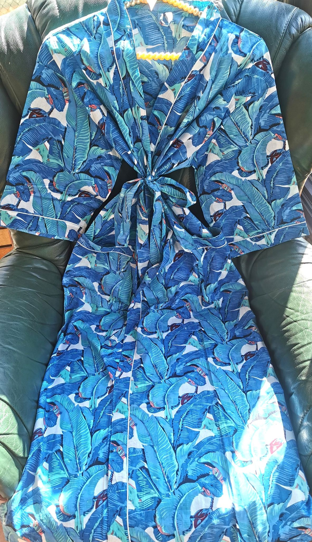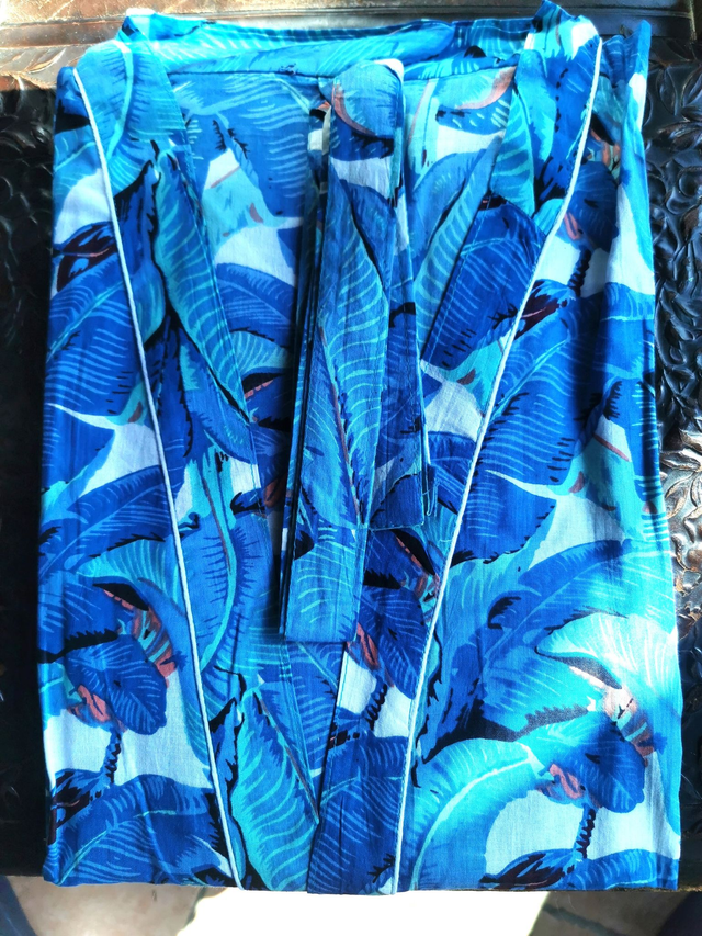 Un kimono en coton naturel, inspiré des palmeraies tropicales et des brises océanes. Son imprimé luxuriant dans des tons de bleu profond et turquoise invite à la détente et au voyage.