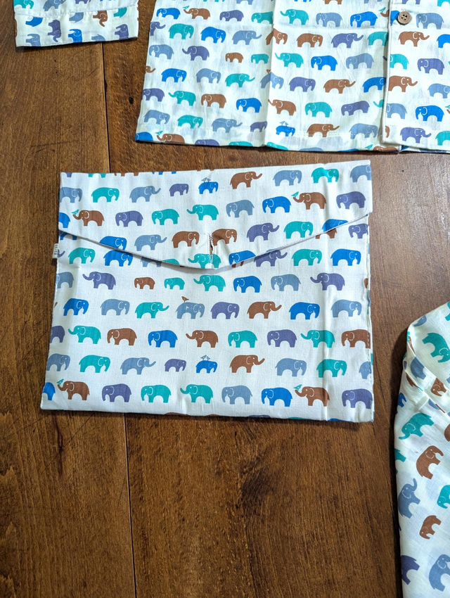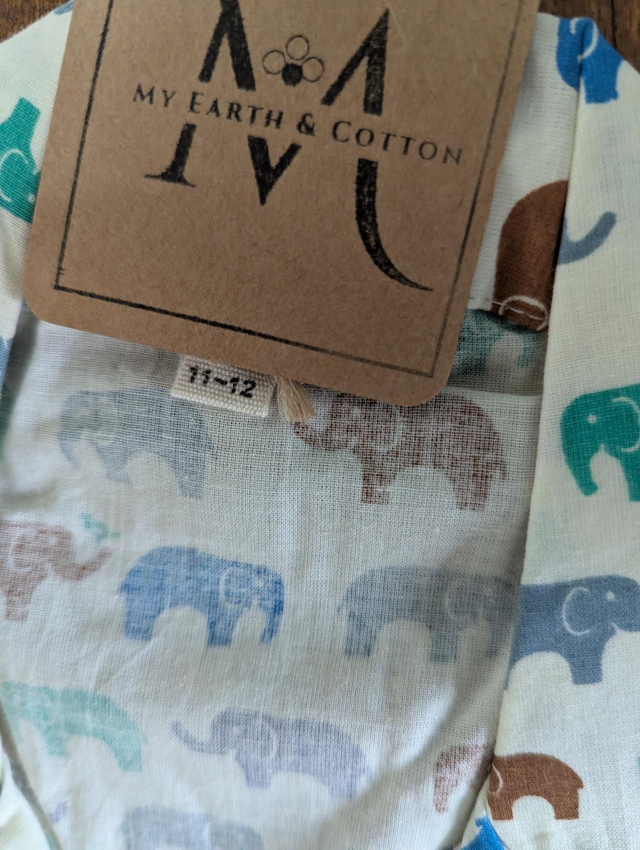 De couleur beige, il est orné d’un joli imprimé d’éléphants dans des tons brun, bleu et gris, apportant une touche à la fois ludique et raffinée.