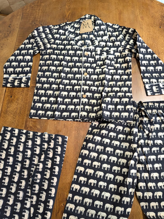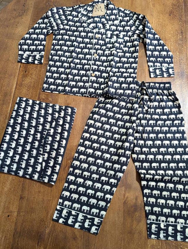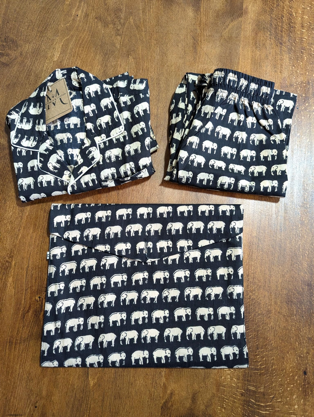 Le pantalon dispose d’une poche pratique, et le pyjama est livré avec une pochette assortie au même motif, idéale pour le rangement ou pour l’emporter facilement en voyage. Léger et respirant, il garantit des nuits paisibles et confortables.