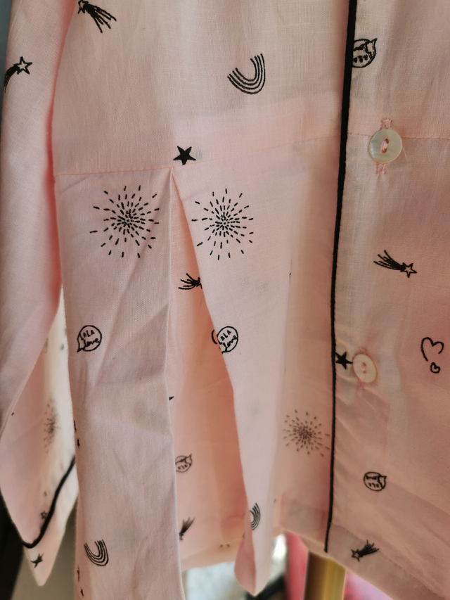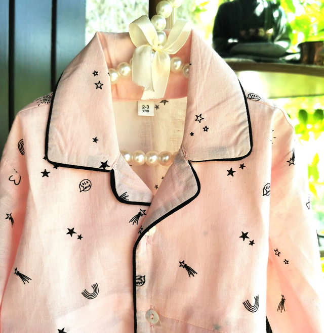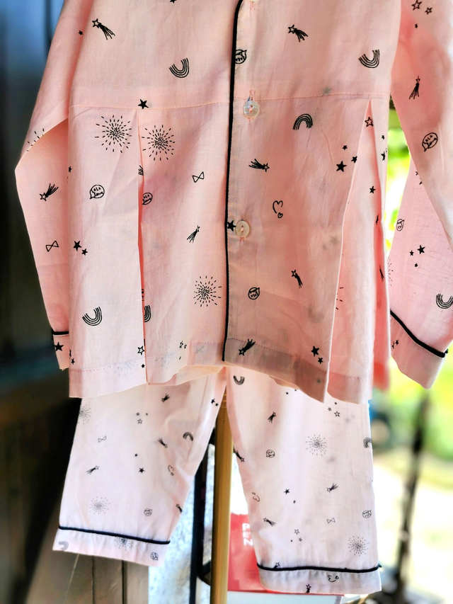 🌙 Motif délicat et girly : De jolis imprimés célestes (étoiles, arcs-en-ciel et petits symboles) sur un fond rose tendre — un look craquant qui plaira autant aux petites rêveuses qu’aux mamans.