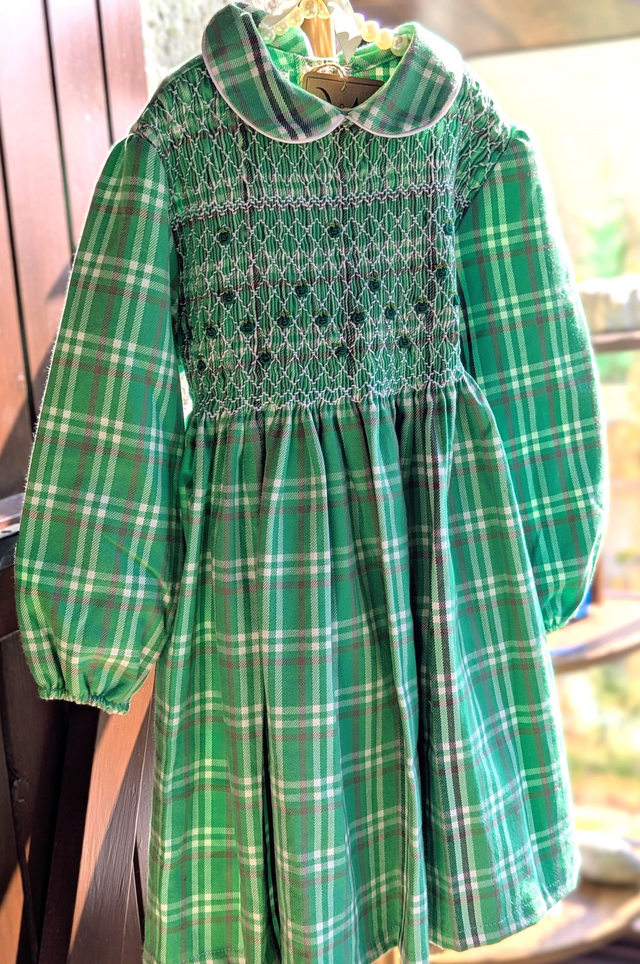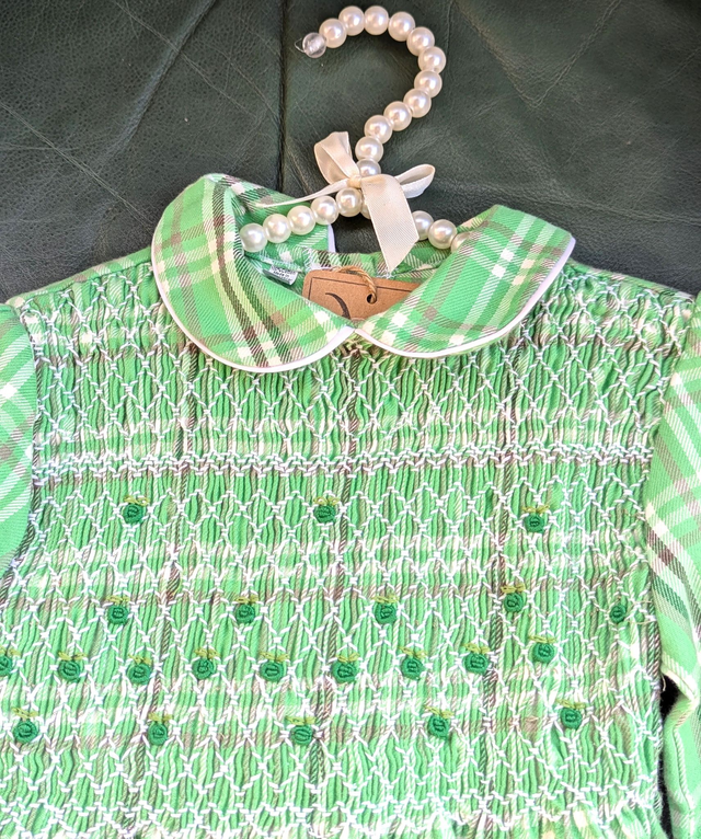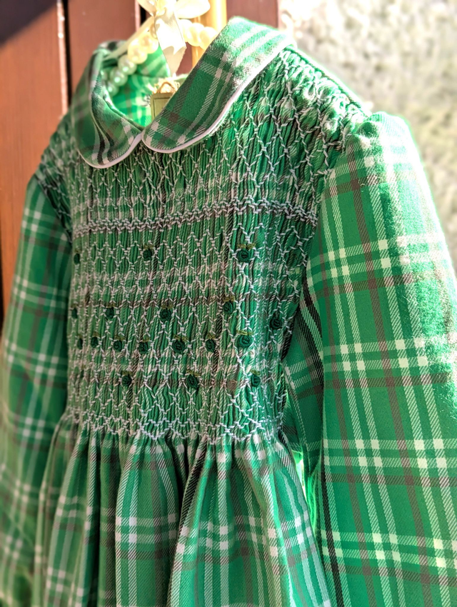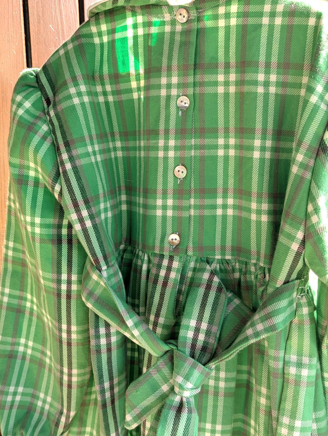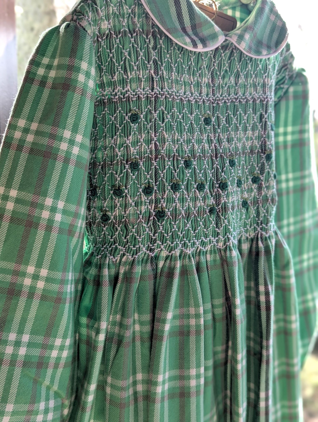 Adoptez un style élégant et confortable cet automne avec cette robe à carreaux vert, blanc et gris, confectionnée en coton doux et respirant. Elle se distingue par ses détails brodés de fleurs vertes sur le col, apportant une touche féminine et délicate.