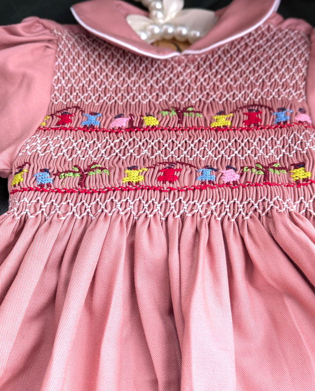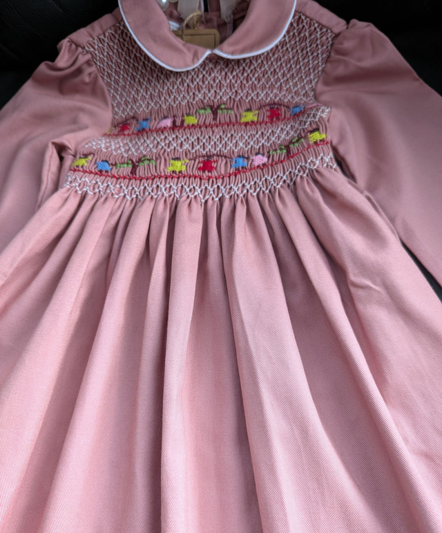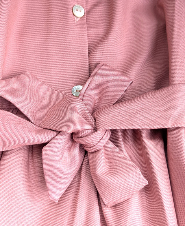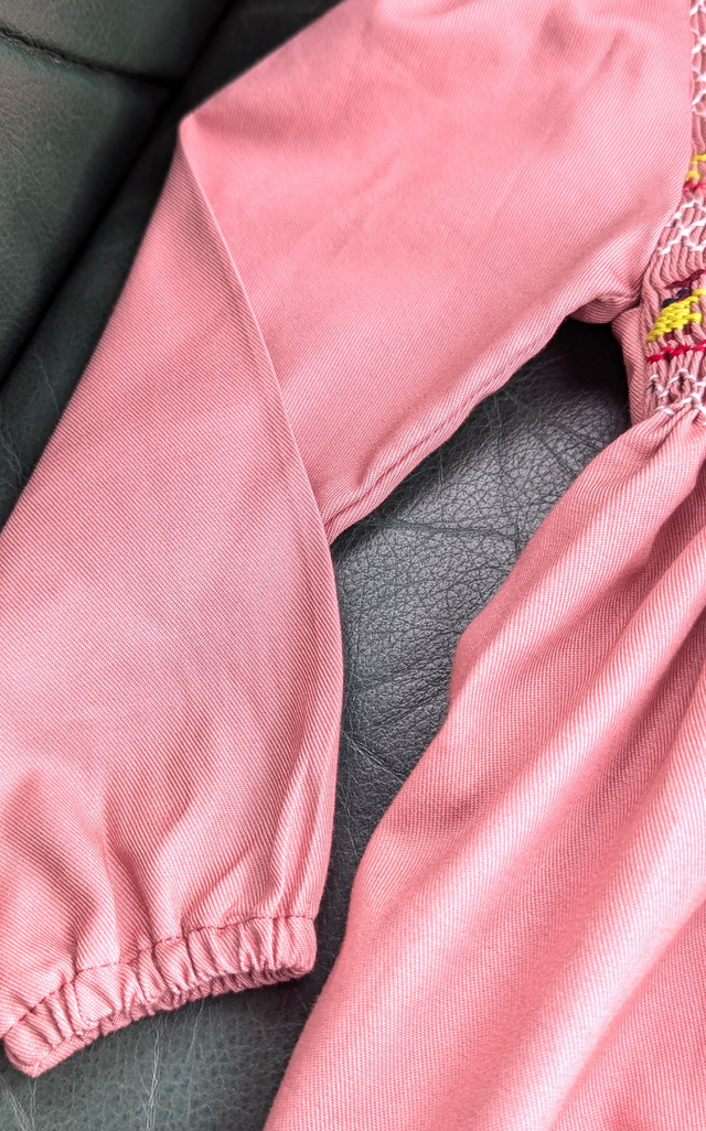 Robe rose brodée artisanale de Madagascar – manches longues, col Claudine, ceinture à nouer